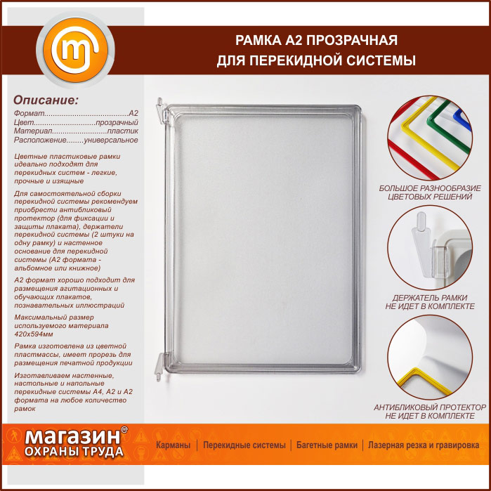 • Для самостоятельной сборки перекидной системы рекомендуем приобрести антибликовый протектор (для фиксации и защиты плаката), держатели перекидной системы (2 штуки на одну рамку) и настенное основание для перекидной системы (А2 формата - альбомное или книжное)