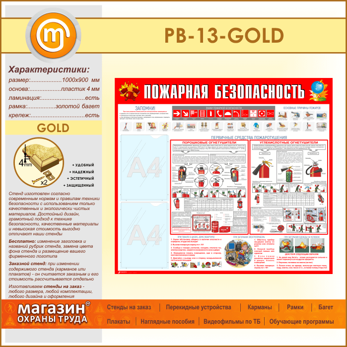 Стенд «Пожарная безопасность» с 2 карманами (PB-13-GOLD) в Краснодаре купить
