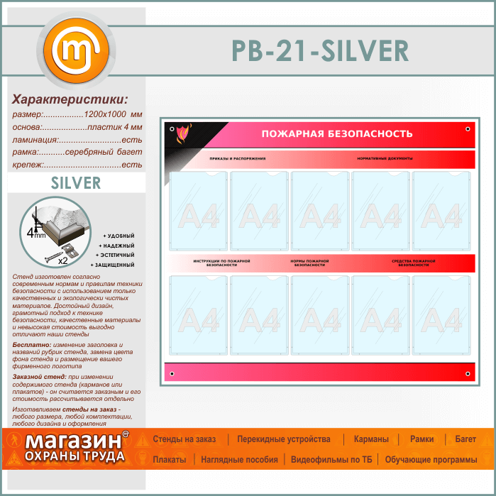 Стенд «Пожарная безопасность» с 10 карманами (PB-21-SILVER) в Краснодаре купить