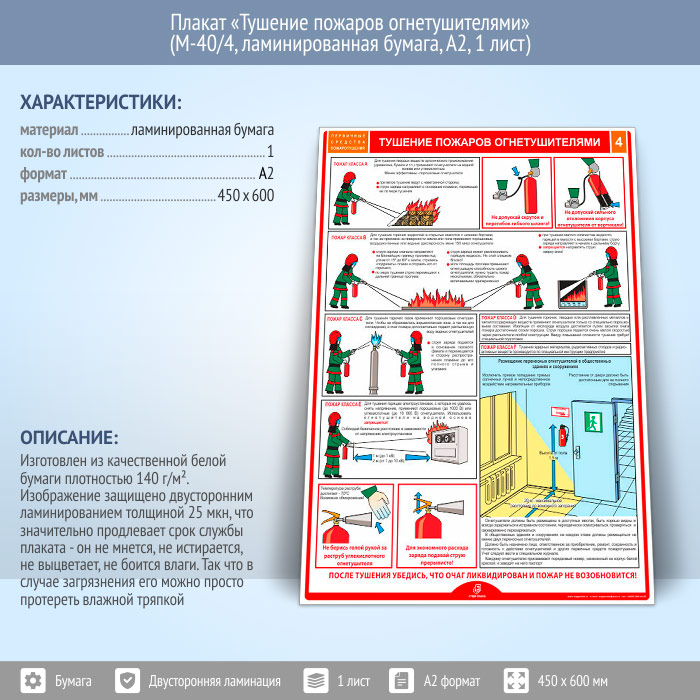 Плакат «Тушение пожаров огнетушителями» (М-40/4, ламинированная бумага, А2, 1 лист) в Краснодаре купить