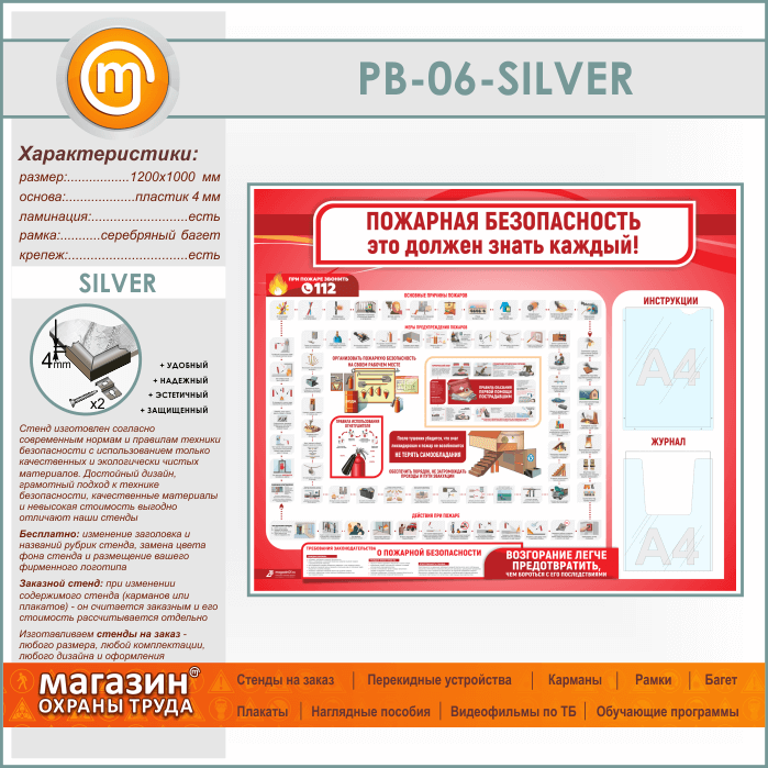 Стенд «Пожарная безопасность. Это должен знать каждый» с плоским и объемным карманами (PB-06-SILVER) в Краснодаре купить