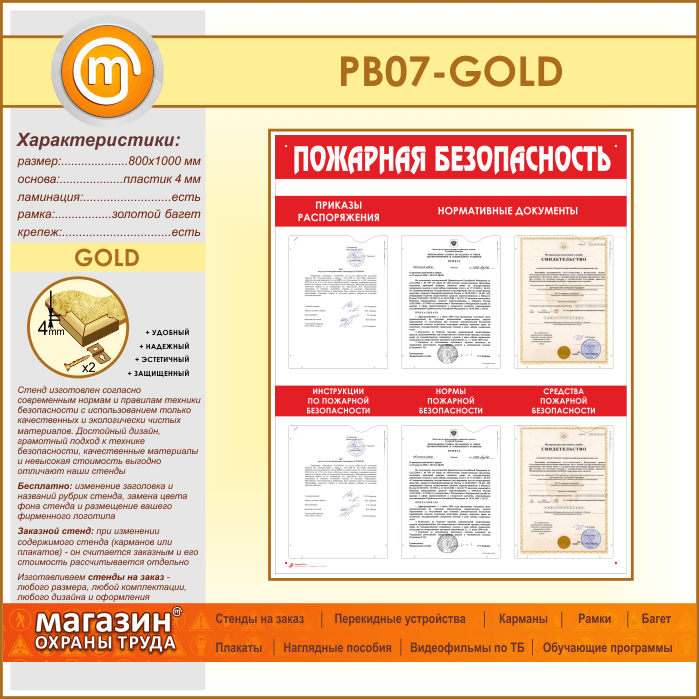 Стенд «Пожарная безопасность» с 6 карманами (PB-07-GOLD) в Краснодаре купить