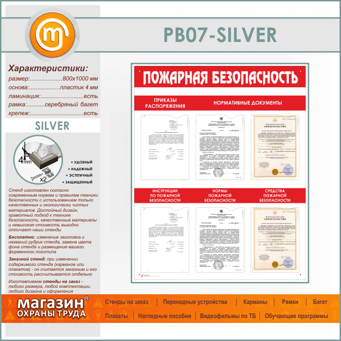 Стенд «Пожарная безопасность» с 6 карманами (PB-07-SILVER) в Краснодаре купить