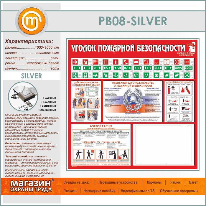Стенд «Уголок пожарной безопасности» с карманом А3 формата (PB-08-SILVER) в Краснодаре купить