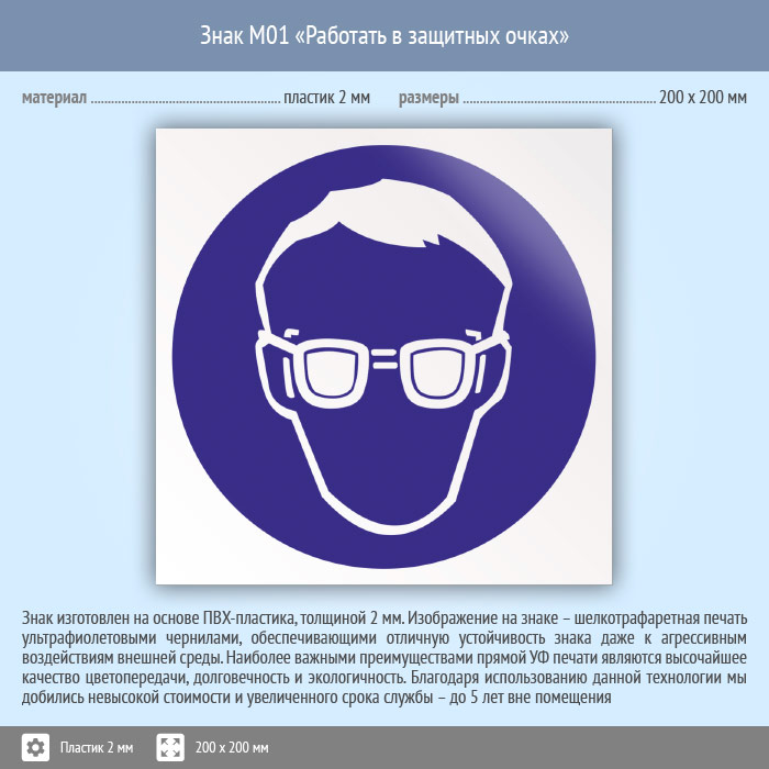 Знак M01 «Работать в защитных очках» (пластик, 200х200 мм) в Краснодаре купить