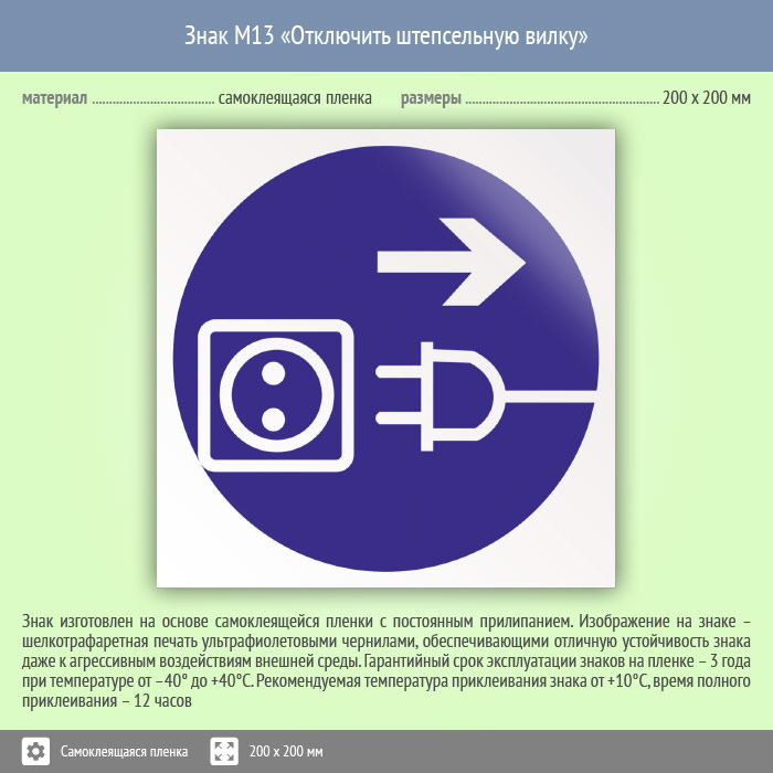 Знак M13 «Отключить штепсельную вилку» (пленка, 200х200 мм) в Краснодаре купить