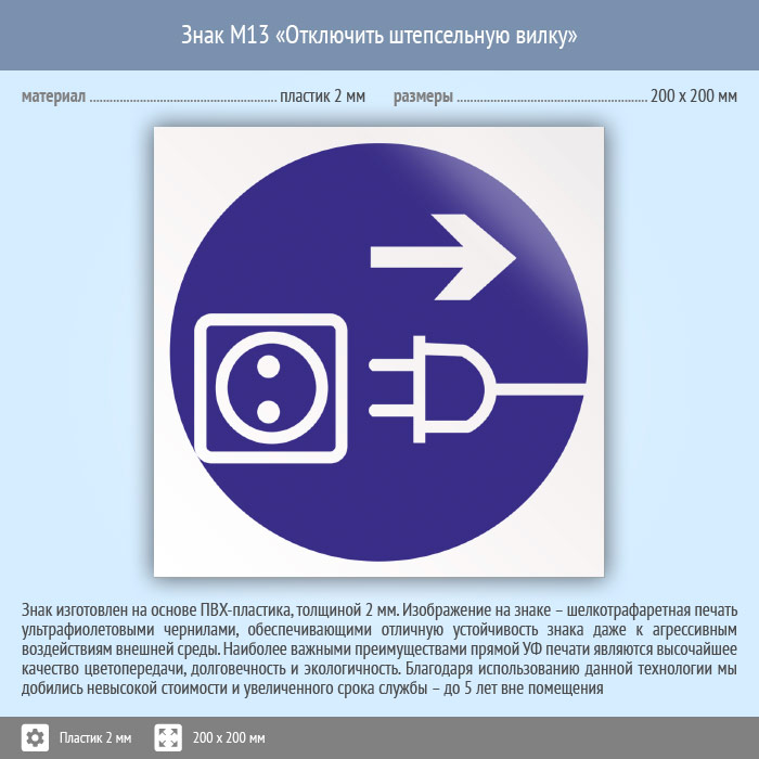 Знак M13 «Отключить штепсельную вилку» (пластик, 200х200 мм) в Краснодаре купить