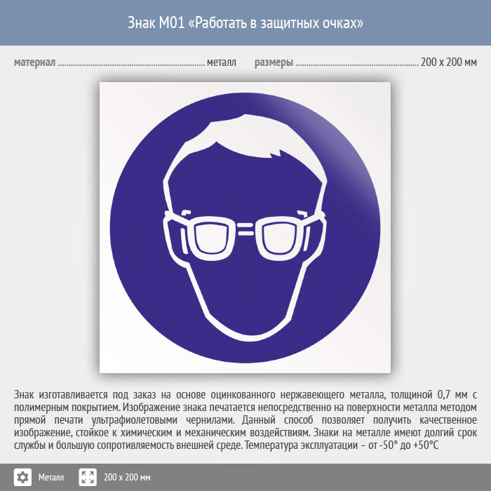 Знак M01 «Работать в защитных очках» (металл, 200х200 мм) в Краснодаре купить