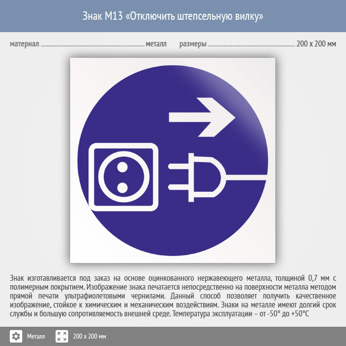 Знак M13 «Отключить штепсельную вилку» (металл, 200х200 мм) в Краснодаре купить