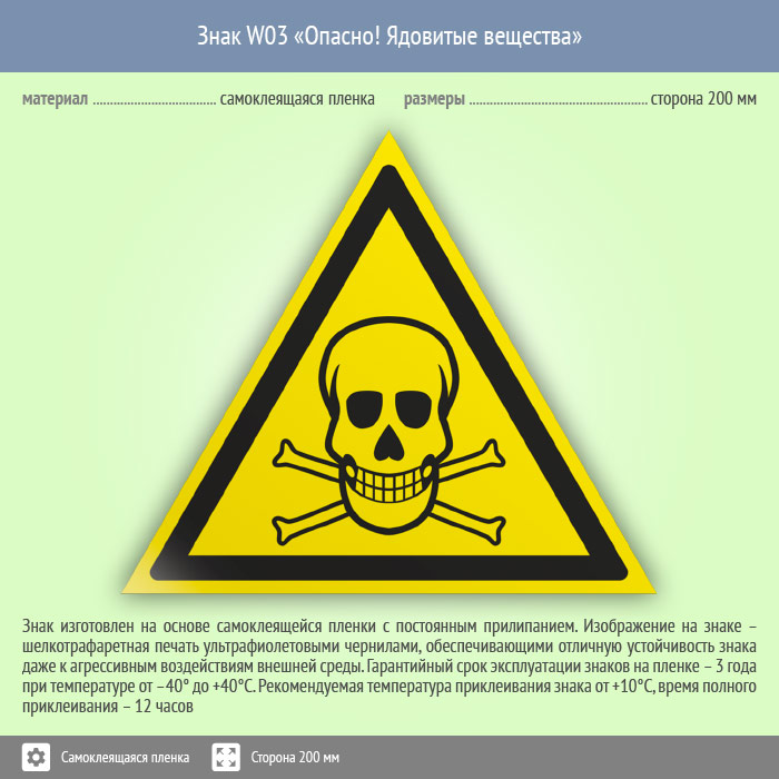 Знак W03 «Опасно! ядовитые вещества» (пленка, сторона 200 мм) в Краснодаре купить