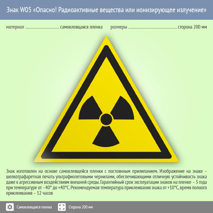 Знак W05 «Опасно! радиоактивные вещества или ионизирующее излучение» (пленка, сторона 200 мм) в Краснодаре купить