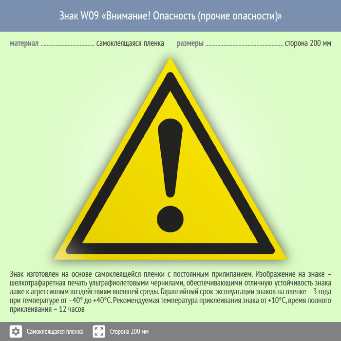 Знак W09 «Внимание! опасность (прочие опасности)» (пленка, сторона 200 мм) в Краснодаре купить