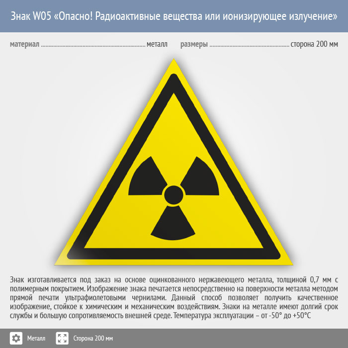Знак W05 «Опасно! радиоактивные вещества или ионизирующее излучение» (металл, сторона 200 мм) в Краснодаре купить