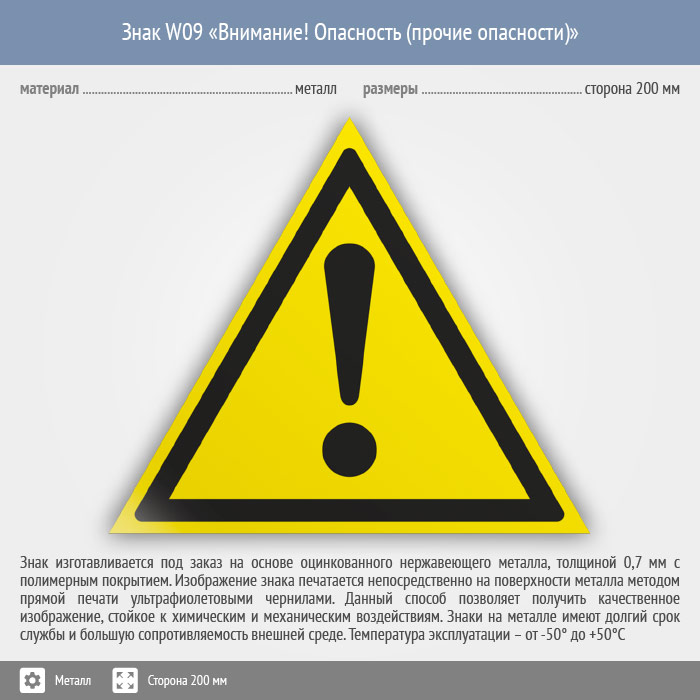 Знак W09 «Внимание! опасность (прочие опасности)» (металл, сторона 200 мм) в Краснодаре купить
