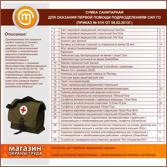 Сумка санитарная для оказания первой помощи подразделениям сил ГО (приказ № 61н от 08.02.2013г.) | Сумка санитарная для оказания первой помощи подразделениям сил ГО (приказ № 61н от 08.02.2013г.) |