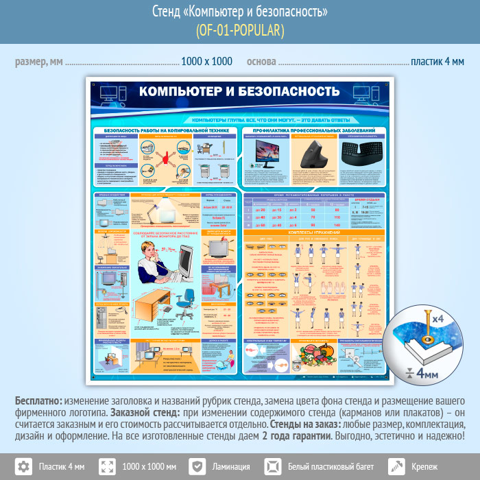 Стенд компьютер и безопасность – научит Вас, как правильно организовать рабочее место – освещение и аэроионизация воздуха, заземление и микроклимат, расположение компьютера в помещении. А также стенд всегда напомнит о вредном воздействии техники на человека, о том – как правильно делать упражнения и снимать усталость после работы за компьютером – комплекс упражнений для рук, глаз спины и время их выполнения…