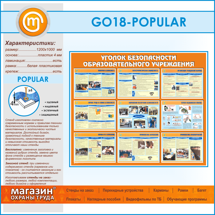 Стенд «Уголок безопасности образовательного учреждения» – помощь при организации безопасности в детских садах, школах, колледжах, институтов – пожарная безопасность и антитеррористическая защищенность, организация гражданской обороны и охрана труда и техники безопасности, направления безопасности и охрана территории, профилактика наркомании и правонарушений, первая медицинская помощь…