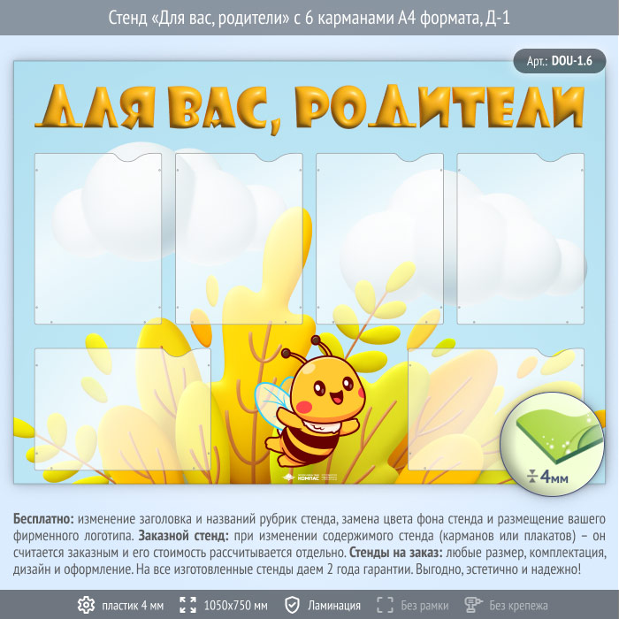 Стенд «Для вас, родители» с 6 карманами А4 формата (DOU-1.6) в Краснодаре купить