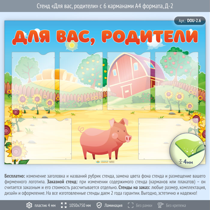 Стенд «Для вас, родители» с 6 карманами А4 формата (DOU-2.6) в Краснодаре купить