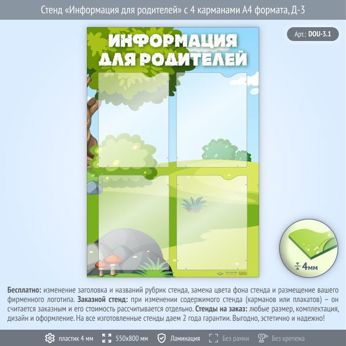 Стенд «Информация для родителей» с 4 карманами А4 формата (DOU-3.1) в Краснодаре купить