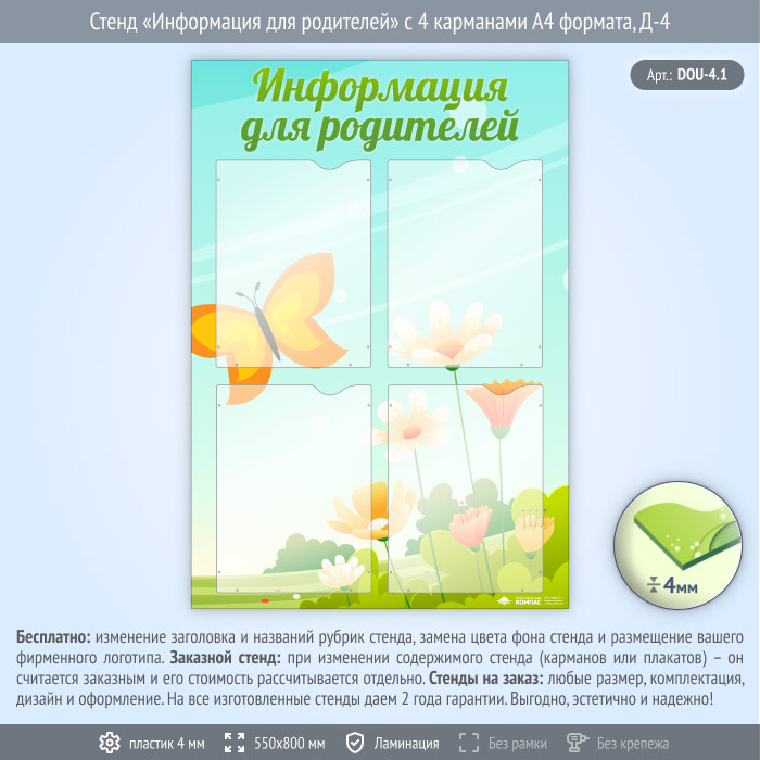 Стенд «Информация для родителей» с 4 карманами А4 формата (DOU-4.1) в Краснодаре купить