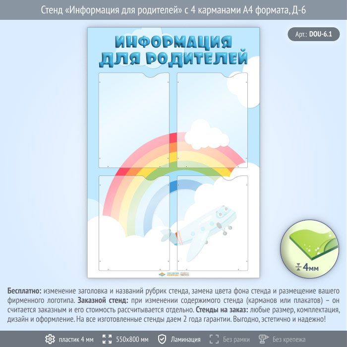 Стенд «Информация для родителей» с 4 карманами А4 формата (DOU-6.1) в Краснодаре купить