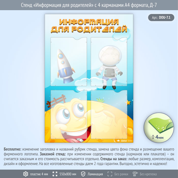 Стенд «Информация для родителей» с 4 карманами А4 формата (DOU-7.1) в Краснодаре купить