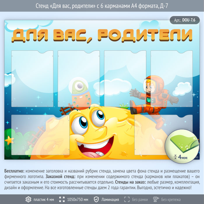 Стенд «Для вас, родители» с 6 карманами А4 формата (DOU-7.6) в Краснодаре купить
