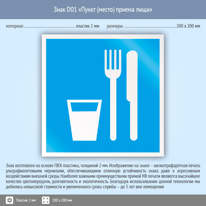 Знак D01 «Пункт (место) приема пищи» (пластик, 200х200 мм) в Краснодаре купить
