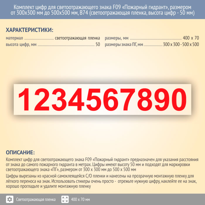 Комплект цифр для светоотражающего знака F09 «Пожарный гидрант», размером от 300х300 мм до 500х500 мм, В74 (светоотражающая пленка, 400х70 мм, высота цифр - 50 мм) в Краснодаре купить