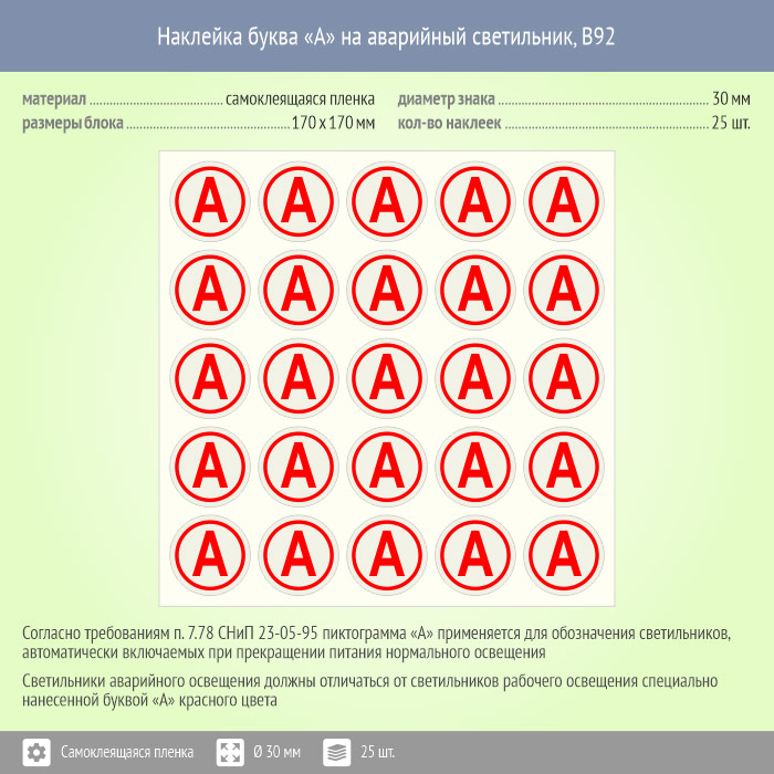 Наклейка буква «А» на аварийный светильник, B92 (пленка, диаметр 30 мм, блок 25 штук, 170х170 мм) в Краснодаре купить