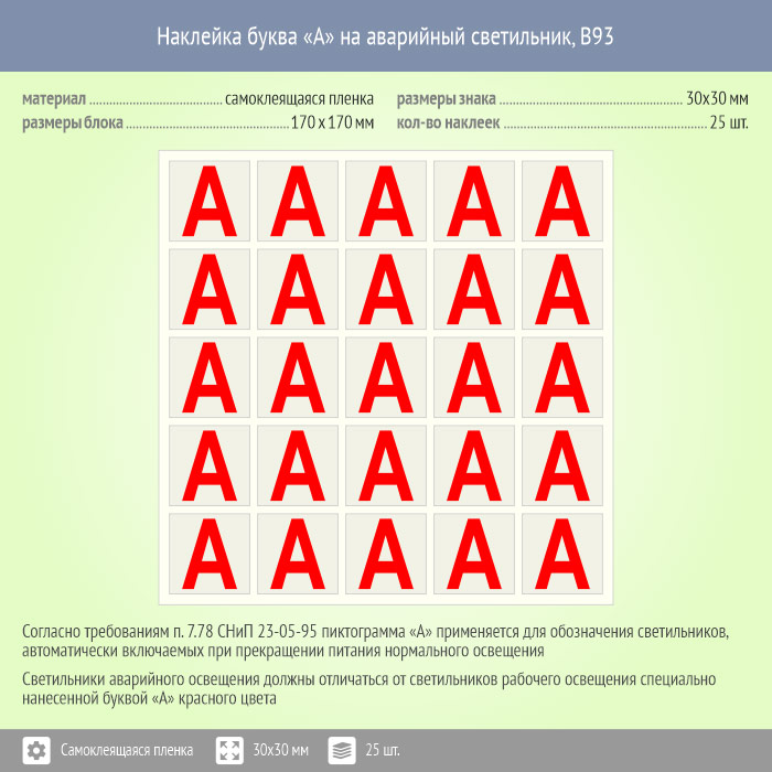 Наклейка буква «А» на аварийный светильник, B93 (пленка, 30х30 мм, блок 25 штук, 170х170 мм) в Краснодаре купить