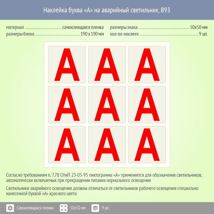 Наклейка буква «А» на аварийный светильник, B93 (пленка, 50х50 мм, блок 9 штук, 190х190 мм) в Краснодаре купить
