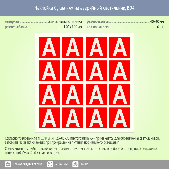 Наклейка буква «А» на аварийный светильник, B94 (пленка, 40х40 мм, блок 16 штук, 190х190 мм) в Краснодаре купить