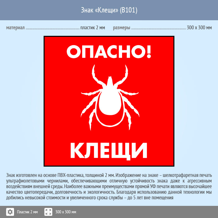 Знак «Опасно! Клещи», B101 (пластик, 300х300 мм) в Краснодаре купить