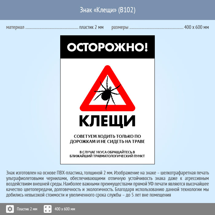 Знак «Осторожно! Клещи», B102 (пластик, 300х400 мм) в Краснодаре купить