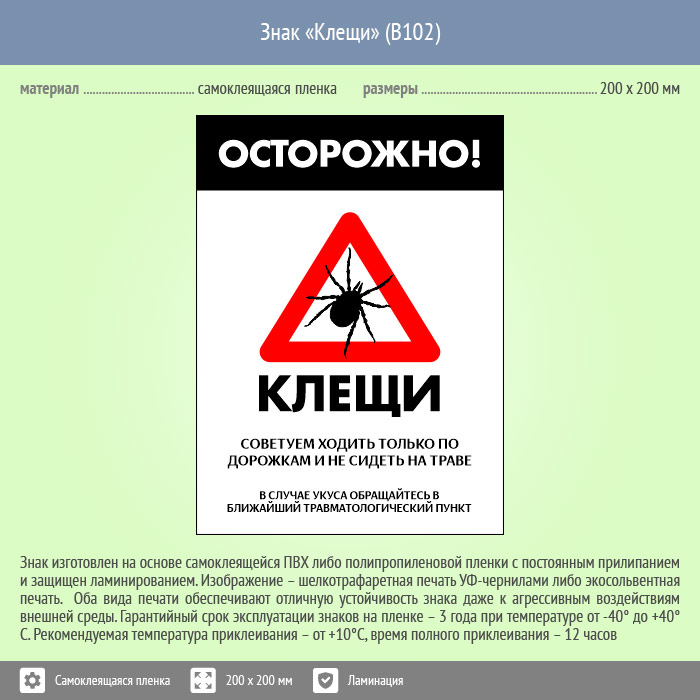Знак «Осторожно! Клещи», B102 (пленка c ламинированием, 400х600 мм) в Краснодаре купить