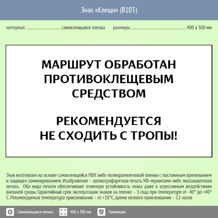 Знак «Клещи», B103 (пленка c ламинированием, 300х200 мм) в Краснодаре купить