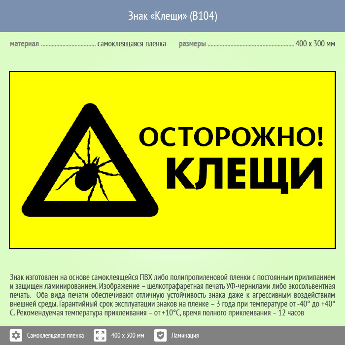 Знак «Осторожно! Клещи», B104 (пленка c ламинированием, 300х200 мм) в Краснодаре купить