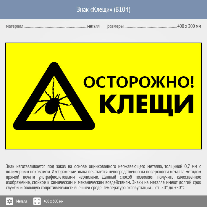 Знак «Осторожно! Клещи», B104 (металл, 300х200 мм) в Краснодаре купить