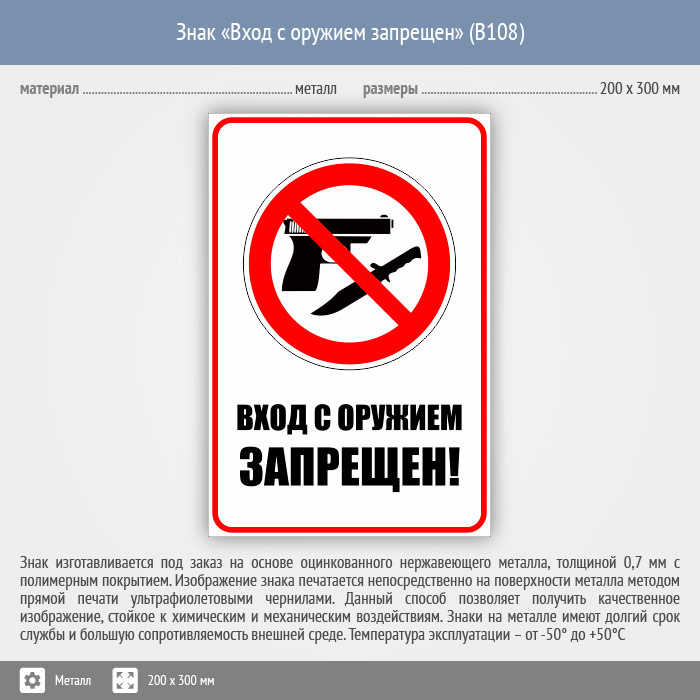 Знак «Вход с оружием запрещен», B108 (металл, 200х300 мм) в Краснодаре купить