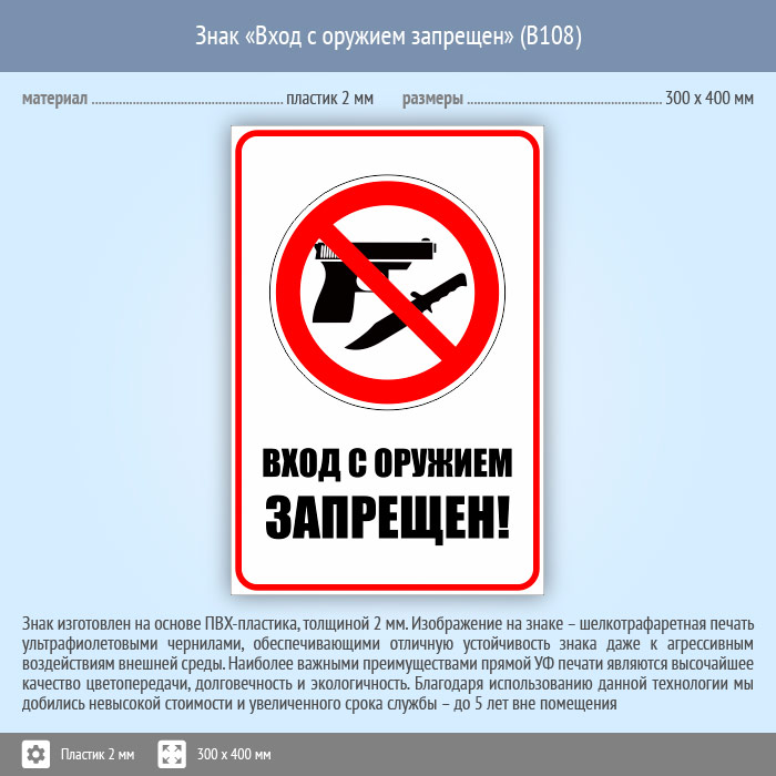 Знак «Вход с оружием запрещен», B108 (пластик, 300х400 мм) в Краснодаре купить