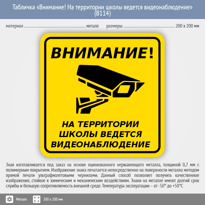 Табличка «Внимание! На территории школы ведется видеонаблюдение», B114 (металл, 200х200 мм) в Краснодаре купить
