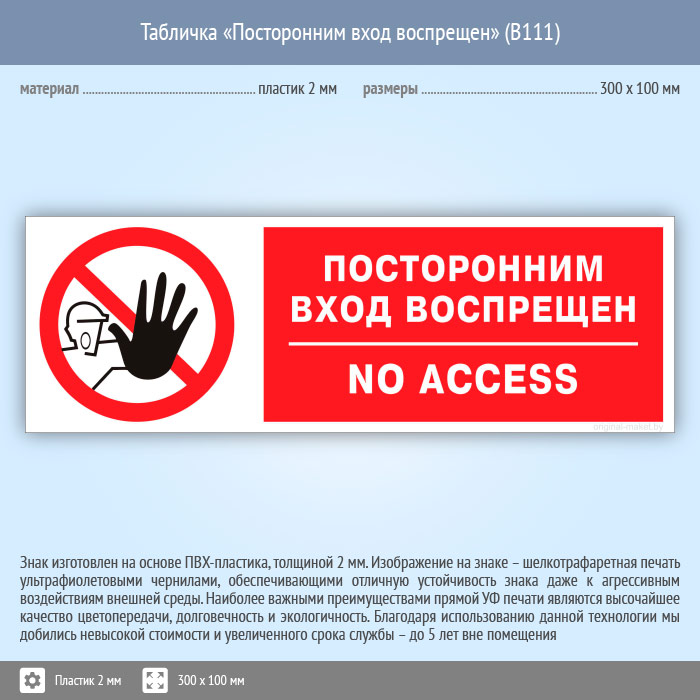 Табличка «Посторонним вход воспрещен», B111 (пластик, 300х100 мм) в Краснодаре купить