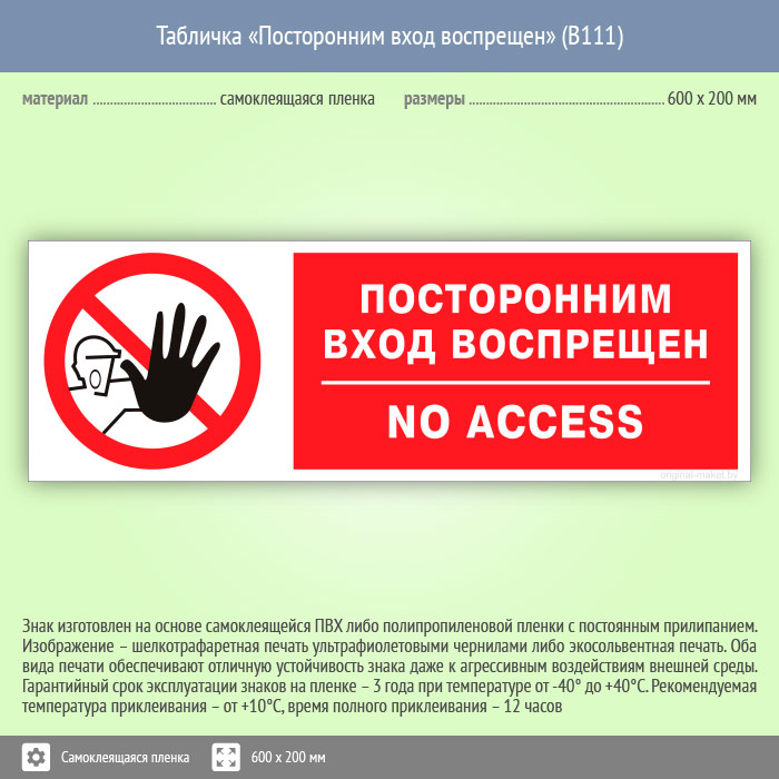 Табличка «Посторонним вход воспрещен», B111 (пленка, 600х200 мм) в Краснодаре купить
