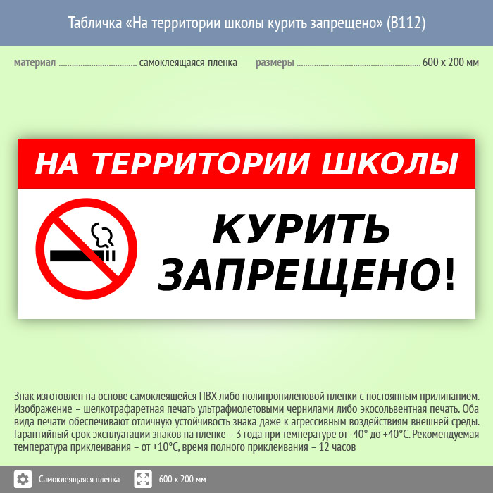 Табличка «На территории школы курить запрещено», B112 (пленка, 600х200 мм) в Краснодаре купить