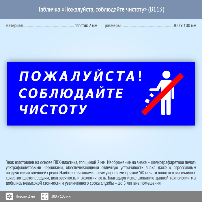 Табличка «Пожалуйста, соблюдайте чистоту», B113 (пластик, 300х100 мм) в Краснодаре купить