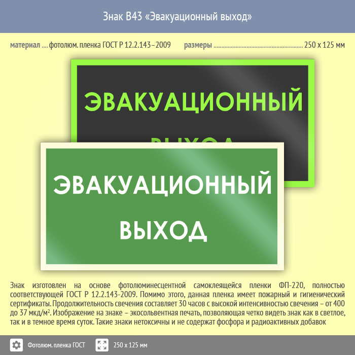 Знак B43 «Эвакуационный выход» (фотолюминесцентная пленка ГОСТ 34428-2018, 250х125 мм) в Краснодаре купить
