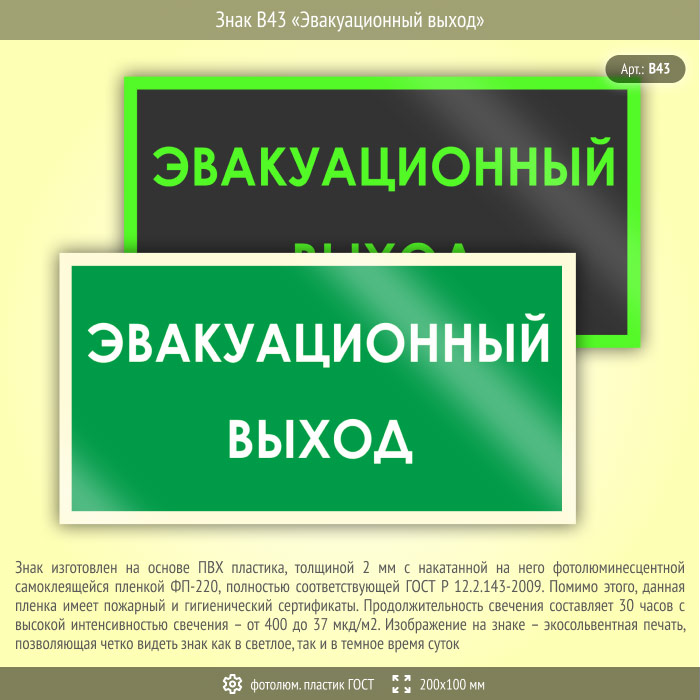 Знак B43 «Эвакуационный выход» (фотолюминесцентный пластик ГОСТ 34428-2018, 200х100 мм) в Краснодаре купить