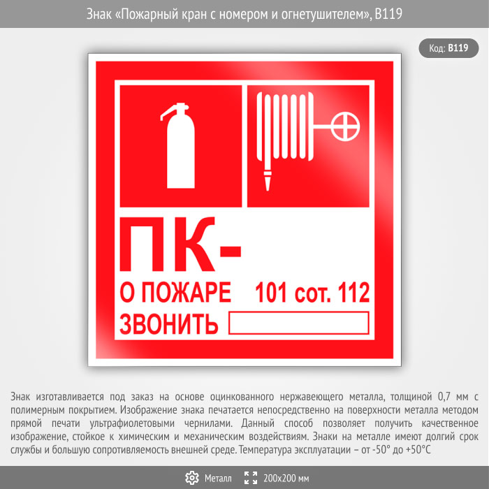 Знак «Пожарный кран с номером и огнетушителем», B119 (металл, 200х200 мм) в Краснодаре купить
